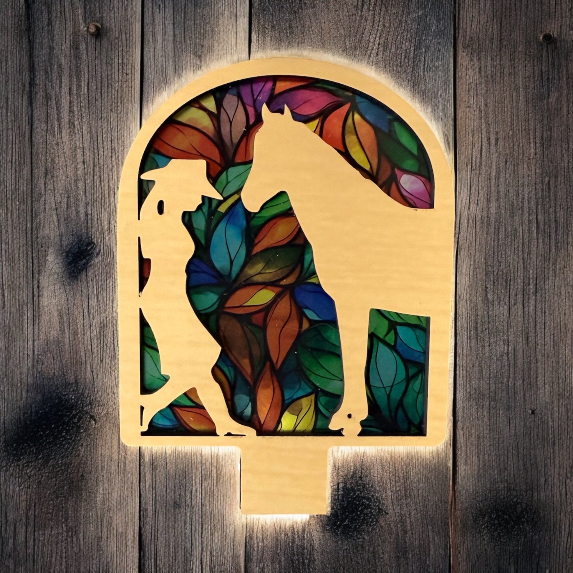 Bring the spirit of the wild west into your home with our Cowgirl & Horse Nightlight. This beautifully crafted design captures the unbreakable bond between a cowgirl and her horse, set against a stunning stained glass-style background. Whether you’re a passionate rider, a country soul, or simply love western-inspired décor, this nightlight adds warmth and charm to any space.