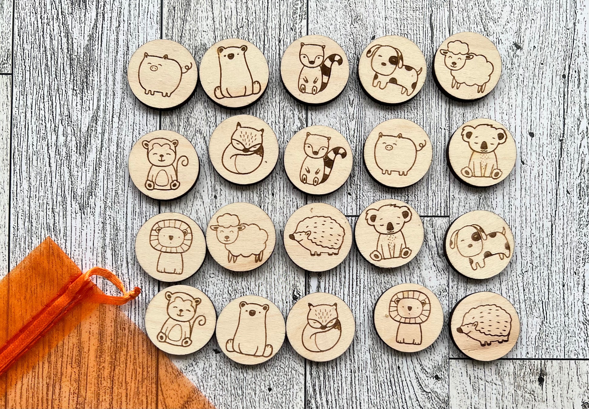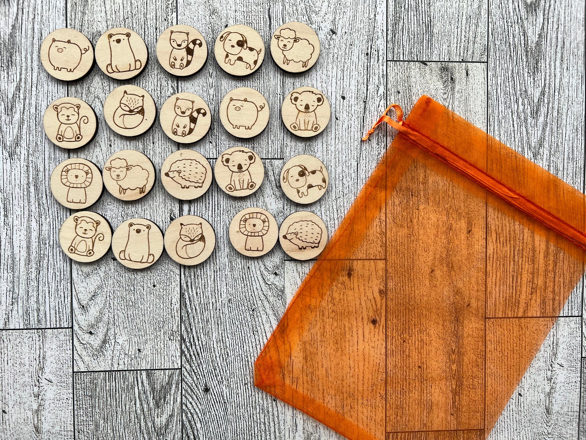 Wood matching game for kids. Includes 20 tokens. You can choose which 10 animals you'd like. Will come with a mesh storage bag.