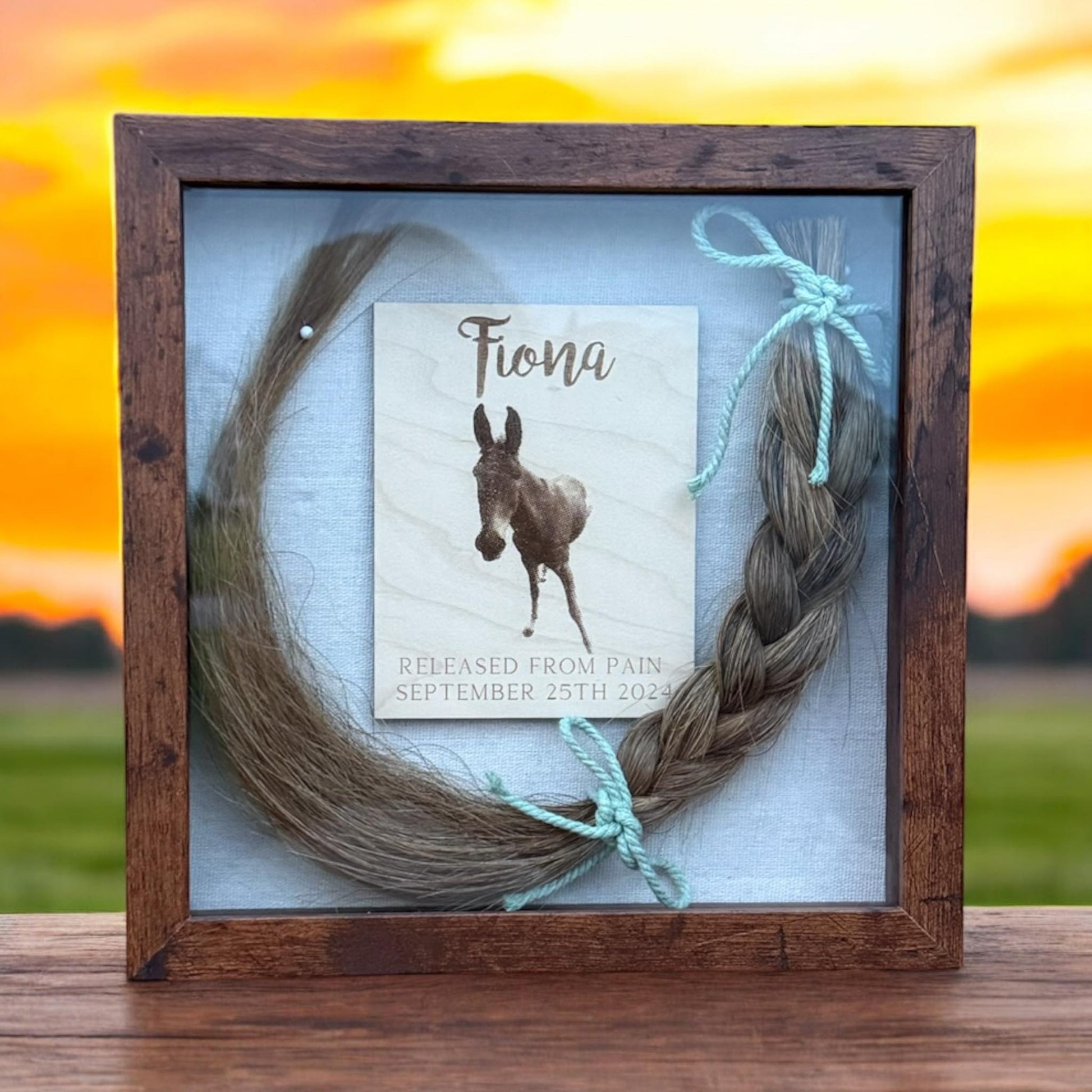 Honor your beloved horse with this Custom 9" x 9" Memorial Shadow Box, thoughtfully designed to hold the memories and mementos that matter most. This smaller, elegant shadow box is the perfect size for displaying meaningful keepsakes like a small braided piece of tail, a nameplate, or other cherished items.