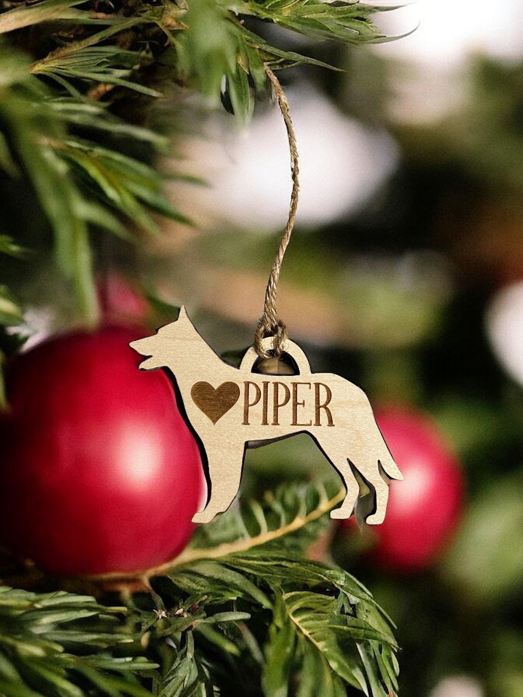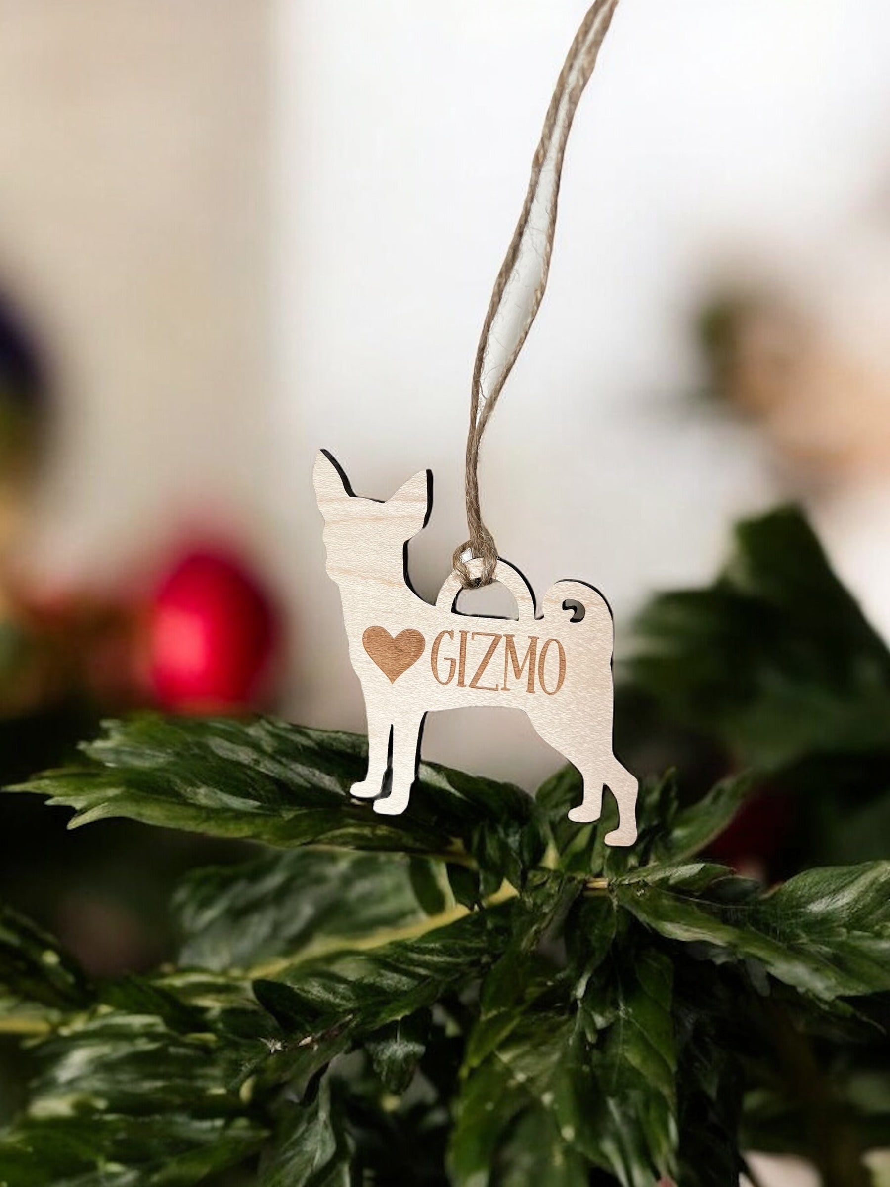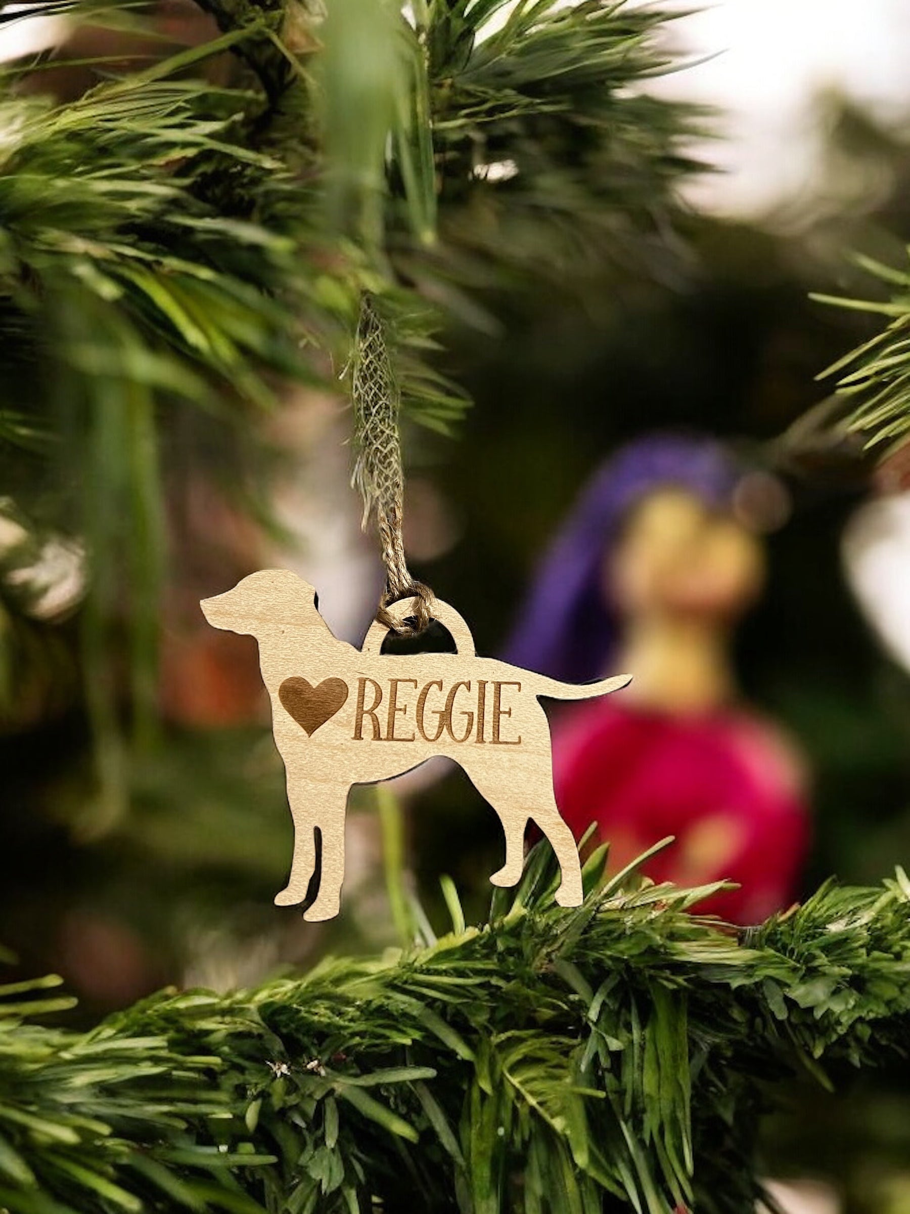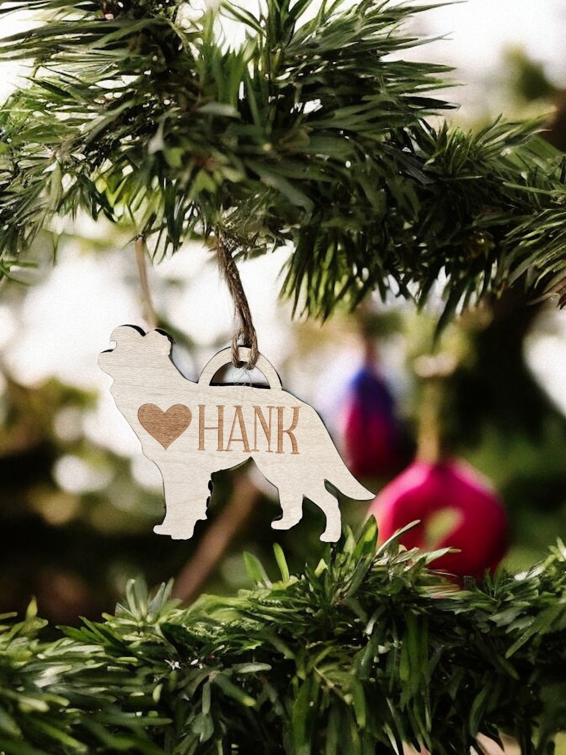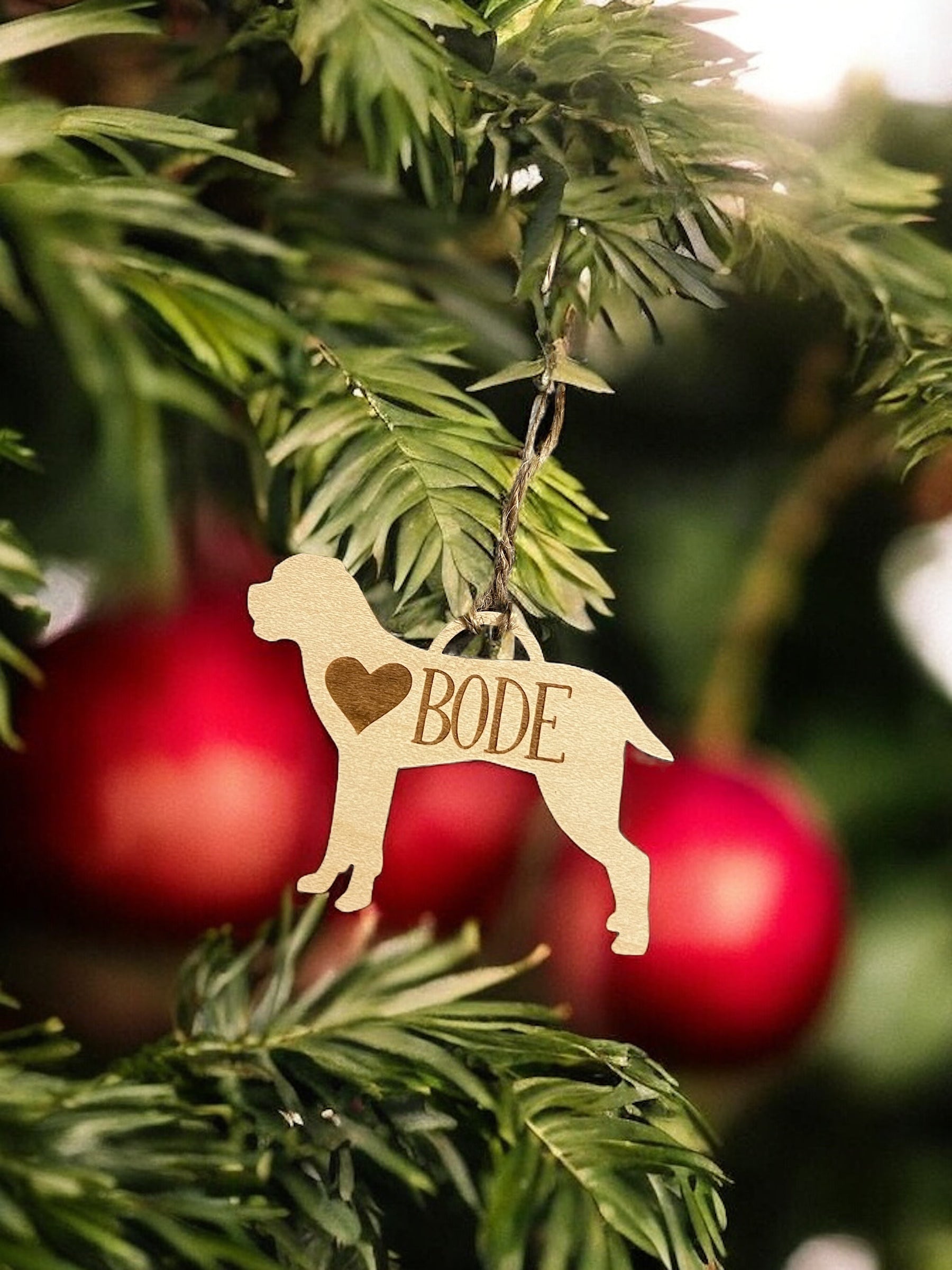 Custom wooden dog ornament measuring 3.5”. Name and heart are engraved into the ornament. I can do different breeds as well.