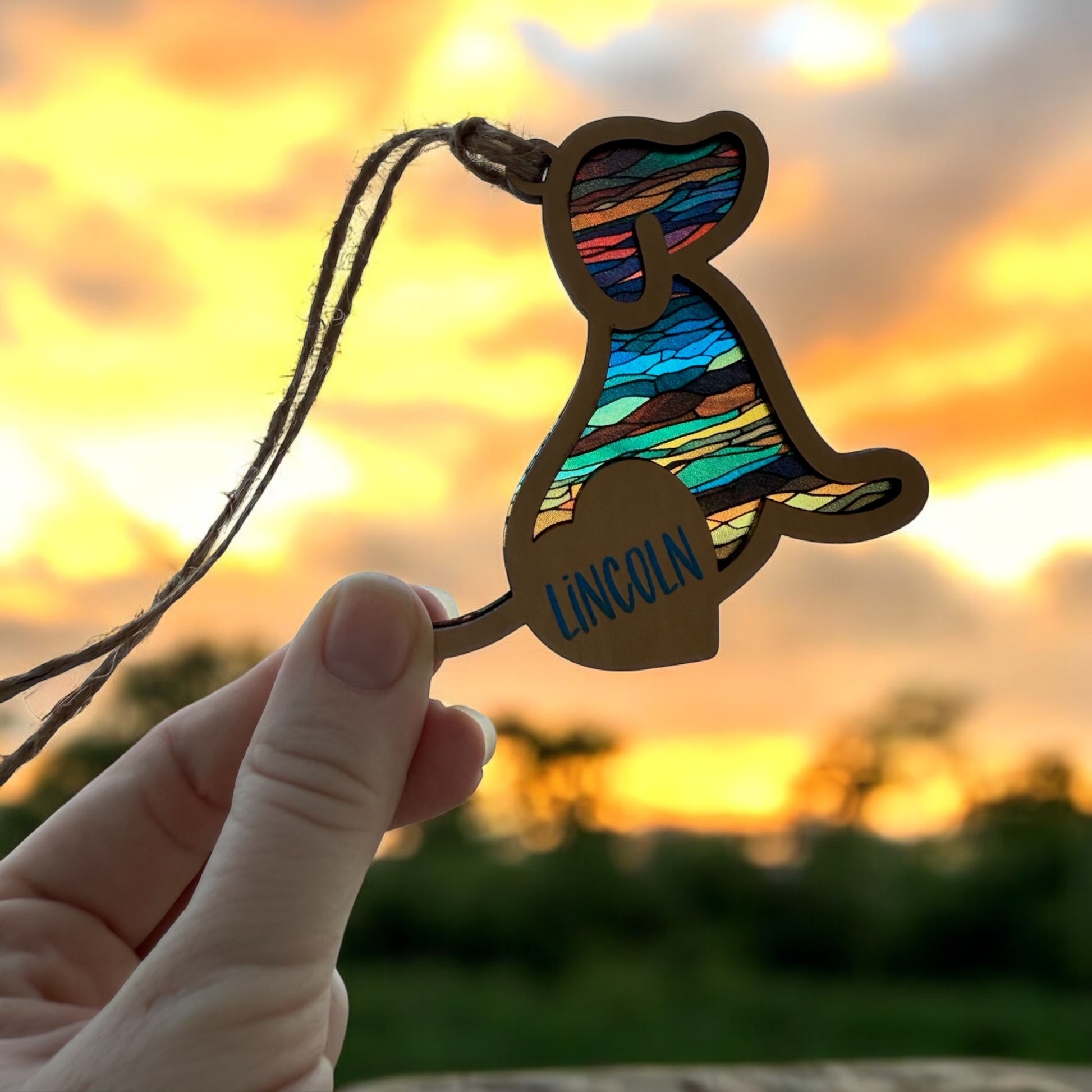Keep your furry friend close wherever you go with our Custom Dog Car Charm! Designed as a sweet reminder of your pup, this charm features a sitting dog silhouette with a heart engraved with your dog’s name. Choose from a variety of body patterns, making this a unique and personal accessory for your car. The cutouts allow light to shine through, creating a beautiful effect as it hangs from your rearview mirror.
