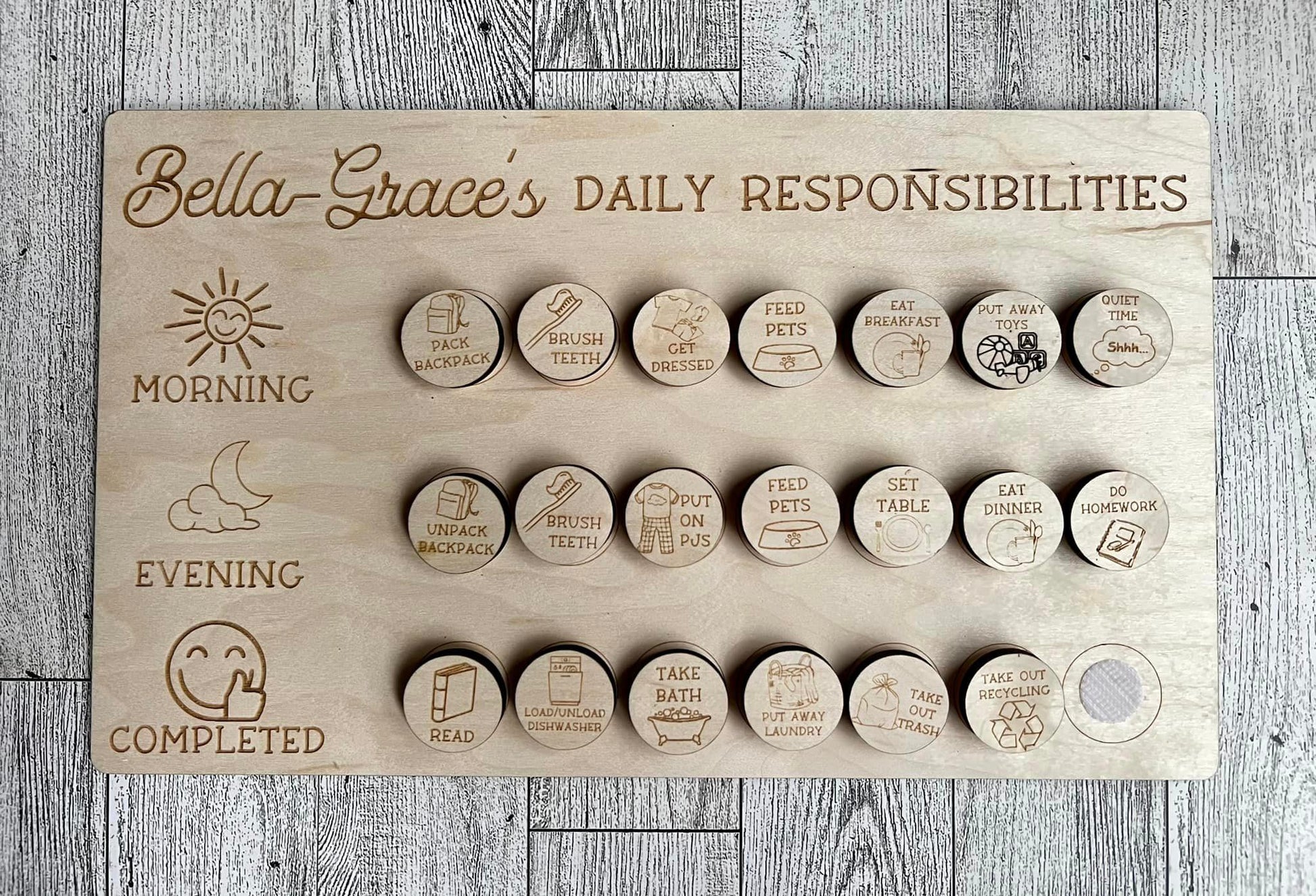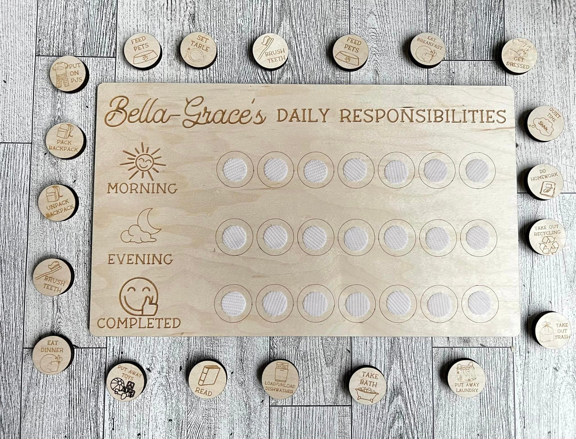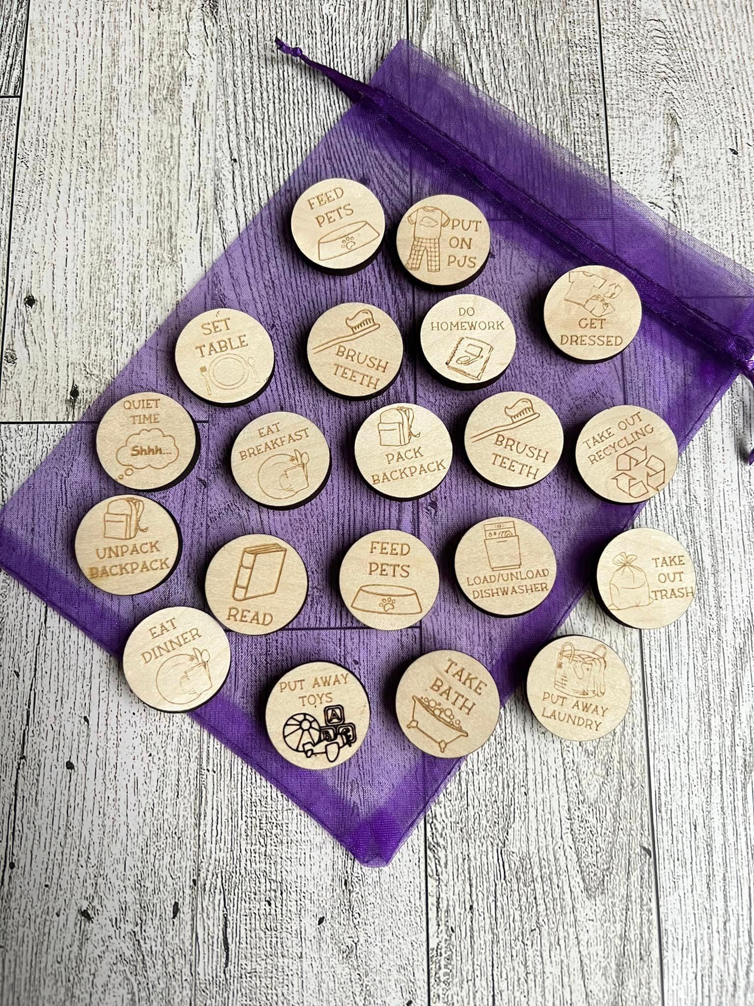 Trying to teach your kid responsibility and independence? This is a great way for them to see what is expected of them daily and be able to move the tokens as their task are completed. They come with a mesh bag to store the tokens not in use. Color of the bag will vary.