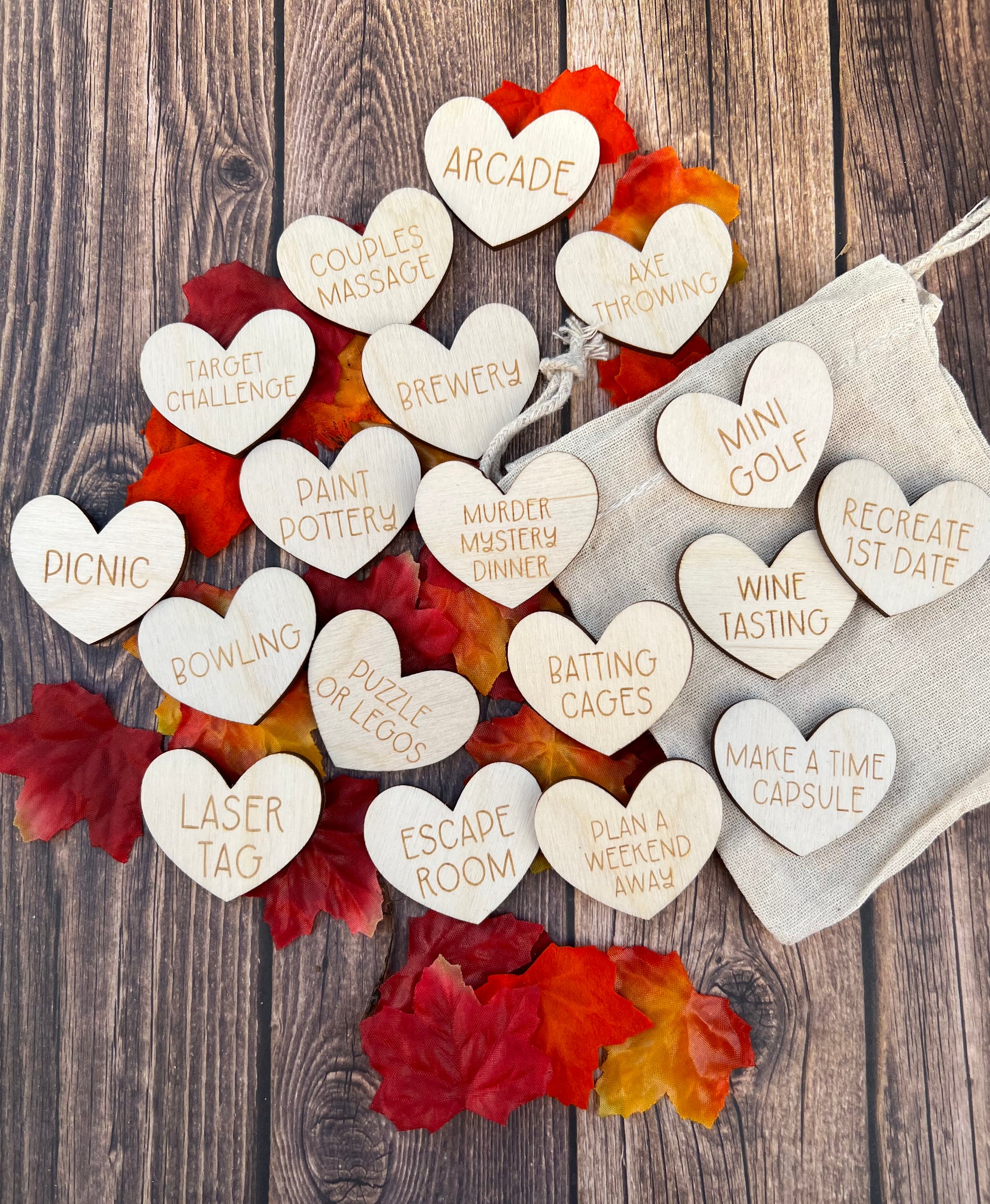 This set includes 18 heart shape tokens with date ideas on them for when you don’t know what to do.