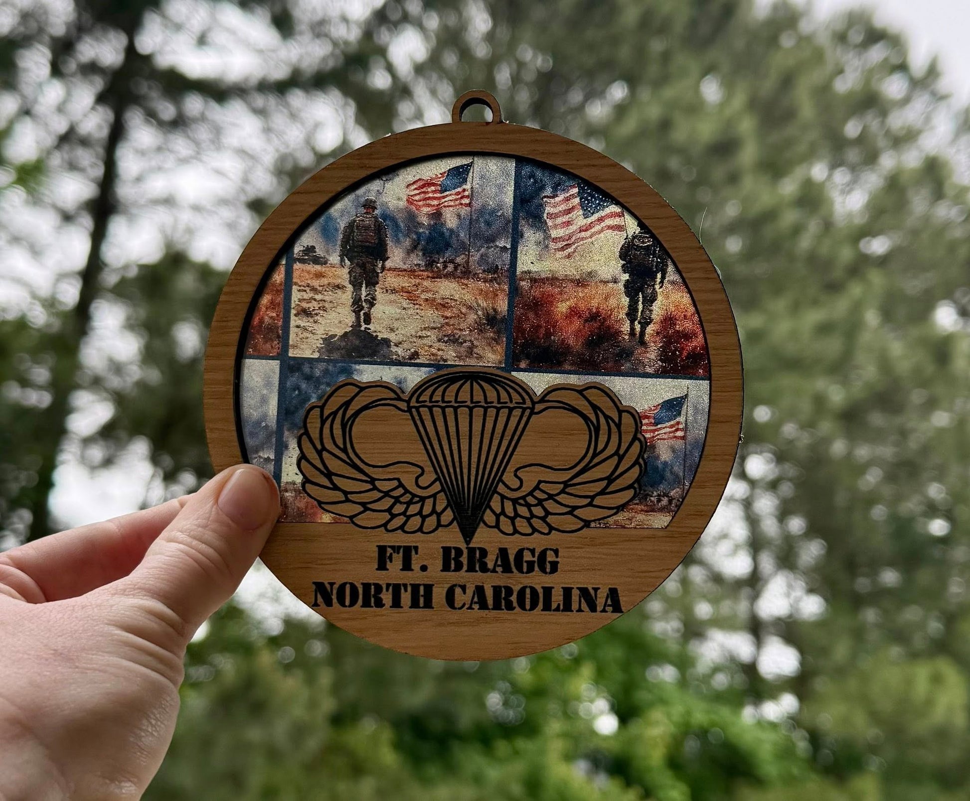 Honor the courage and legacy of our paratroopers with this handcrafted 5" Army-themed sun catcher. Featuring the iconic paratrooper wings badge at its center, each sun catcher is fully customizable with your choice of background and the option to include a military post name and state—making it a meaningful and personalized tribute.