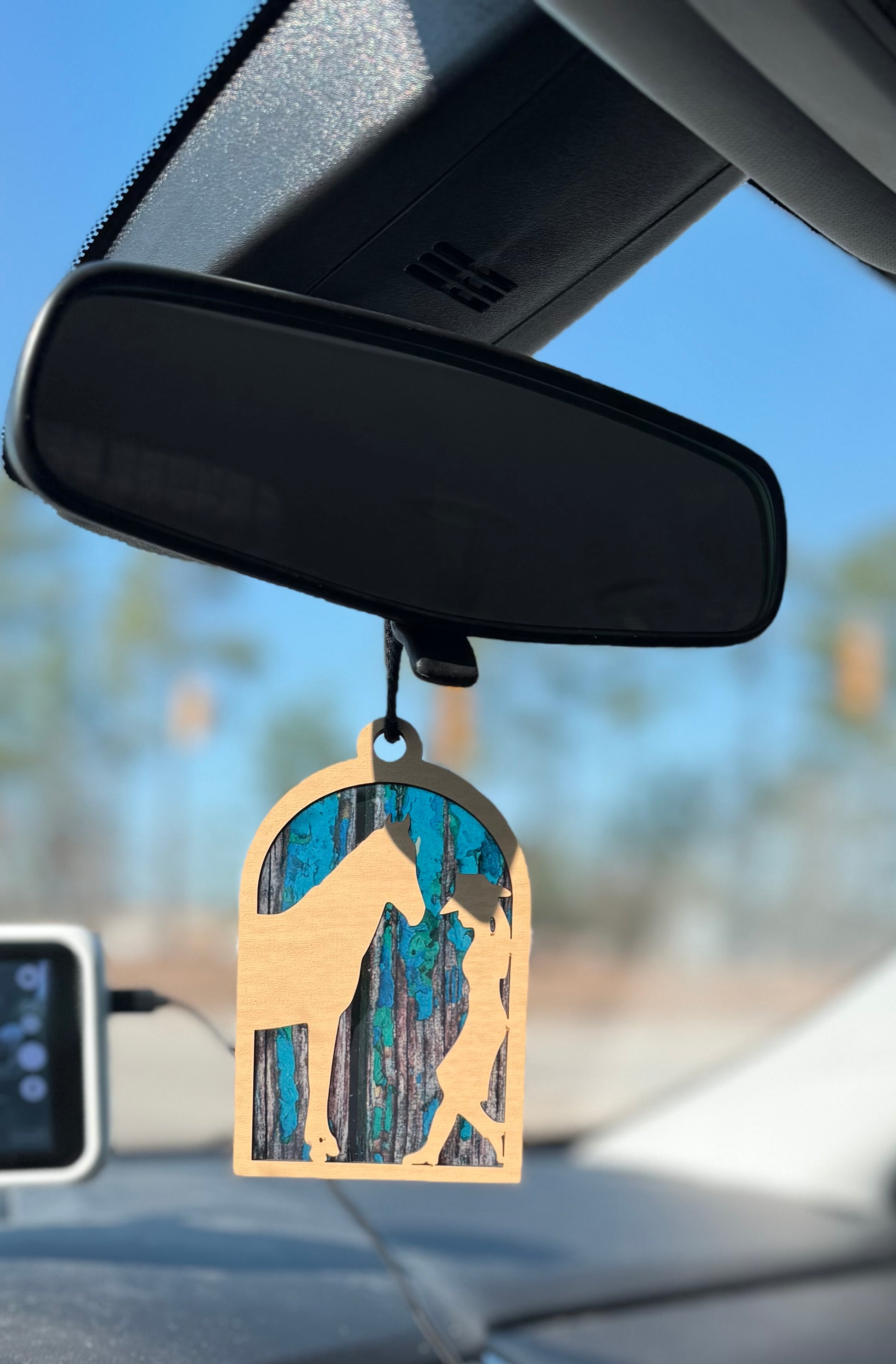 Bring the spirit of the Wild West to your ride with our Cowgirl & Horse Car Charm, set against a rustic blue background. This beautifully crafted design captures the unbreakable bond between a cowgirl and her horse, adding a touch of western charm to your vehicle. Whether you're a passionate rider, a country soul, or simply love western-inspired décor, this car charm is the perfect way to personalize your car.