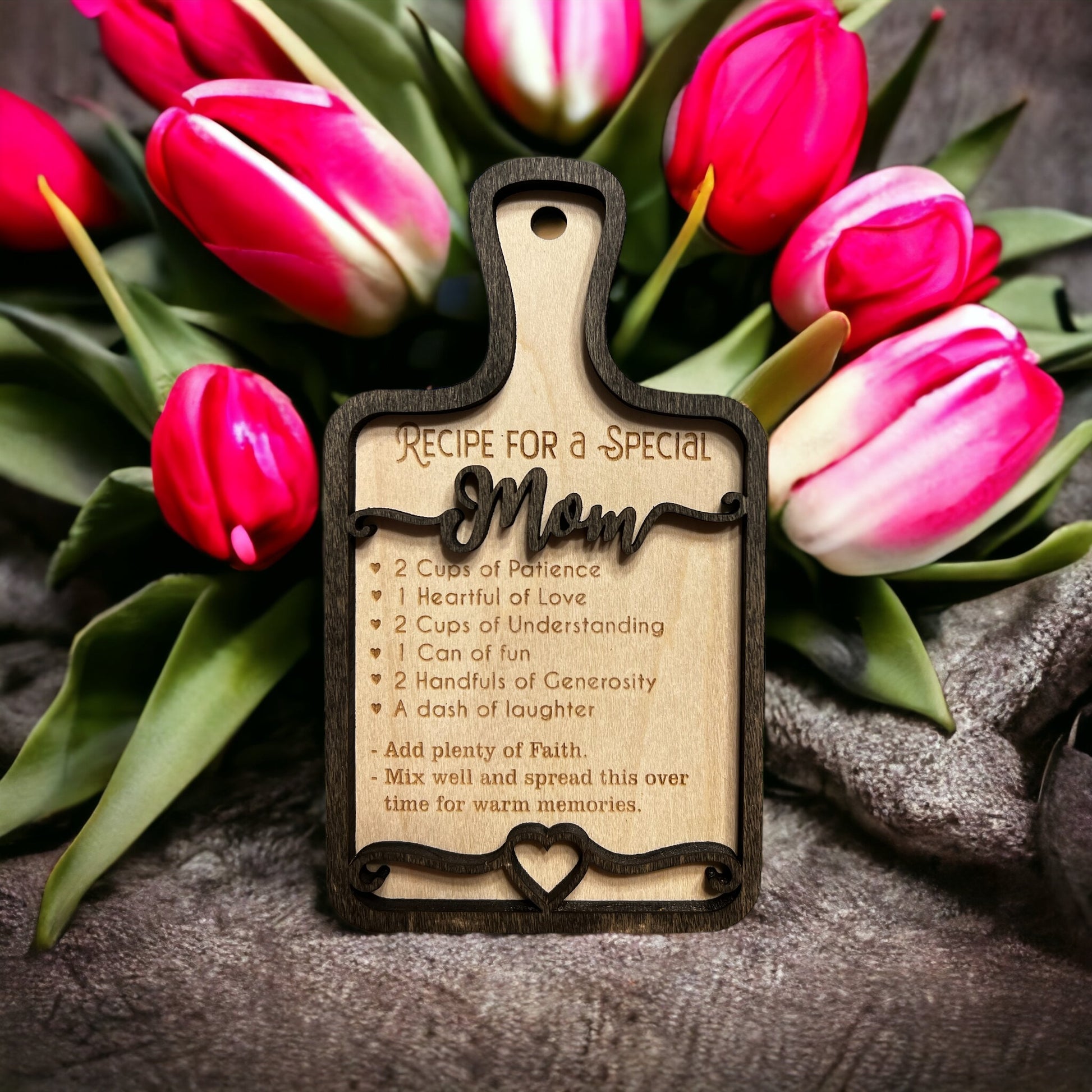 This cutting board sign measures 6" H x 3.4" W. This is a perfect sign to gift to the special mom in your life.