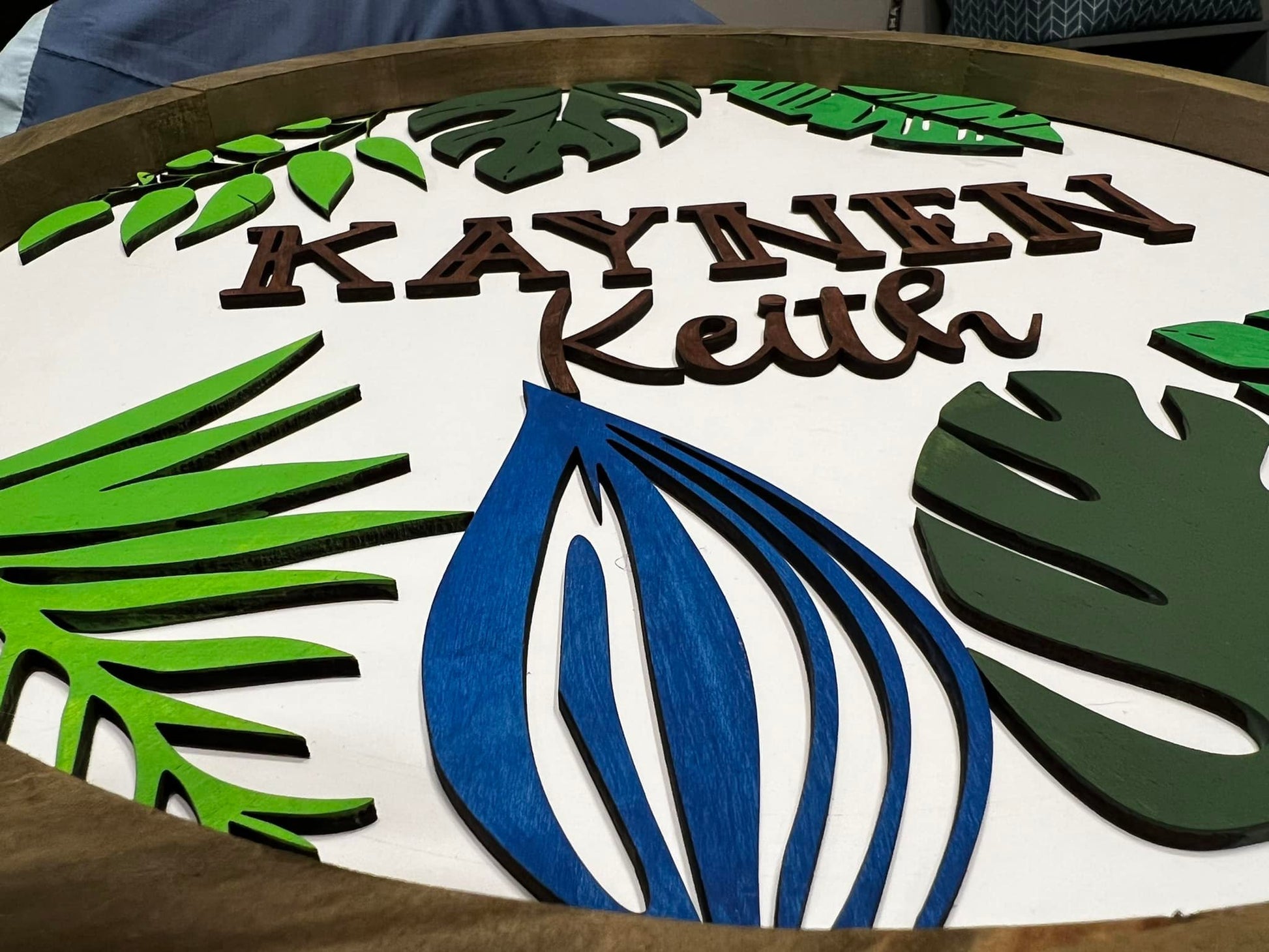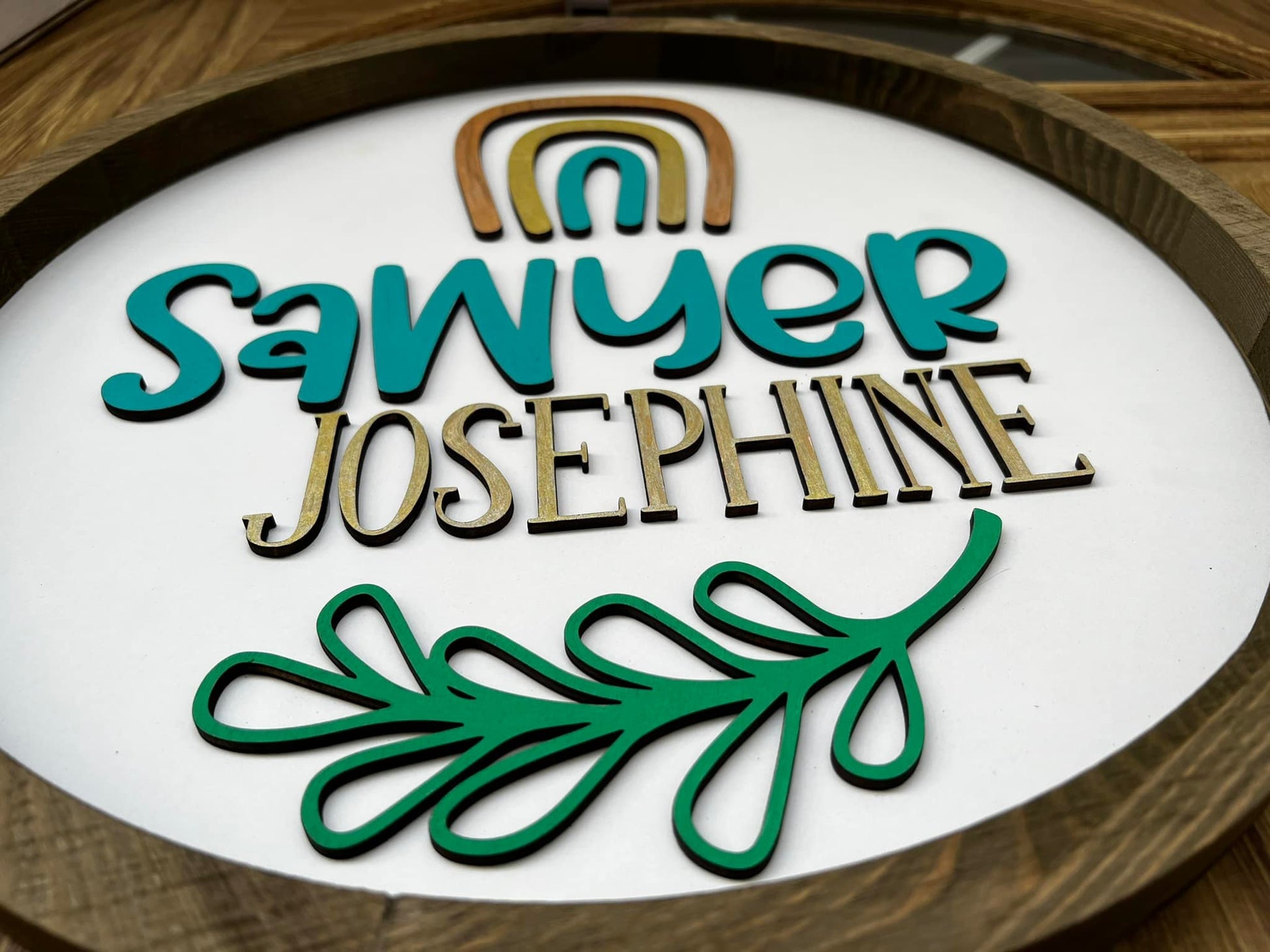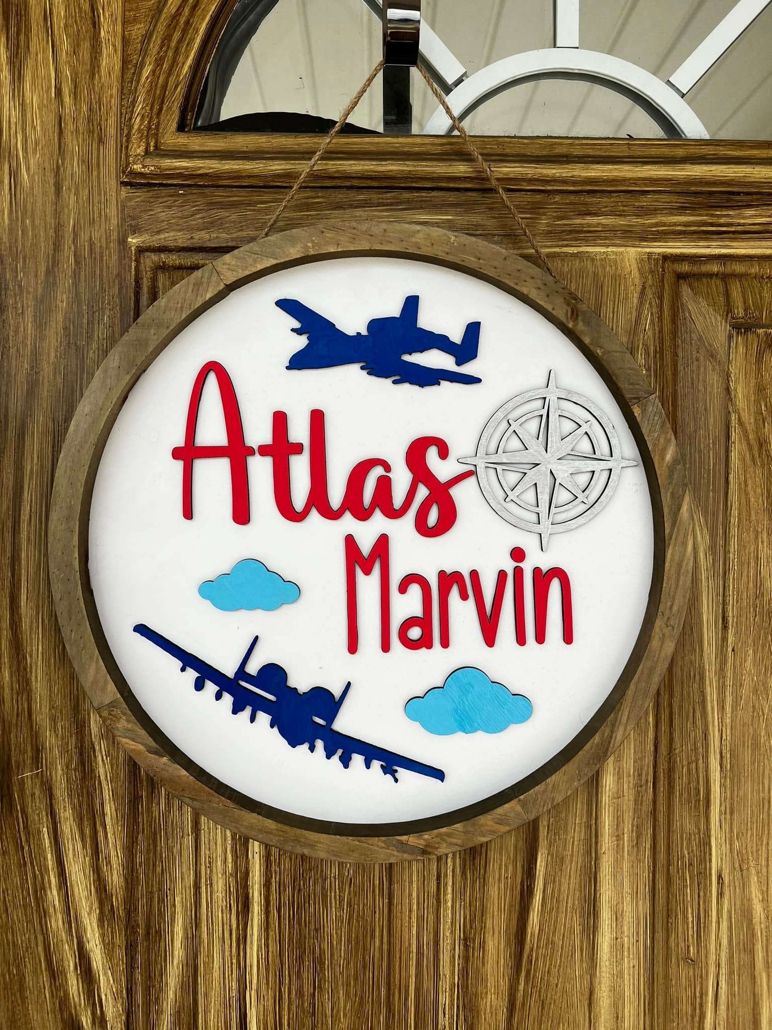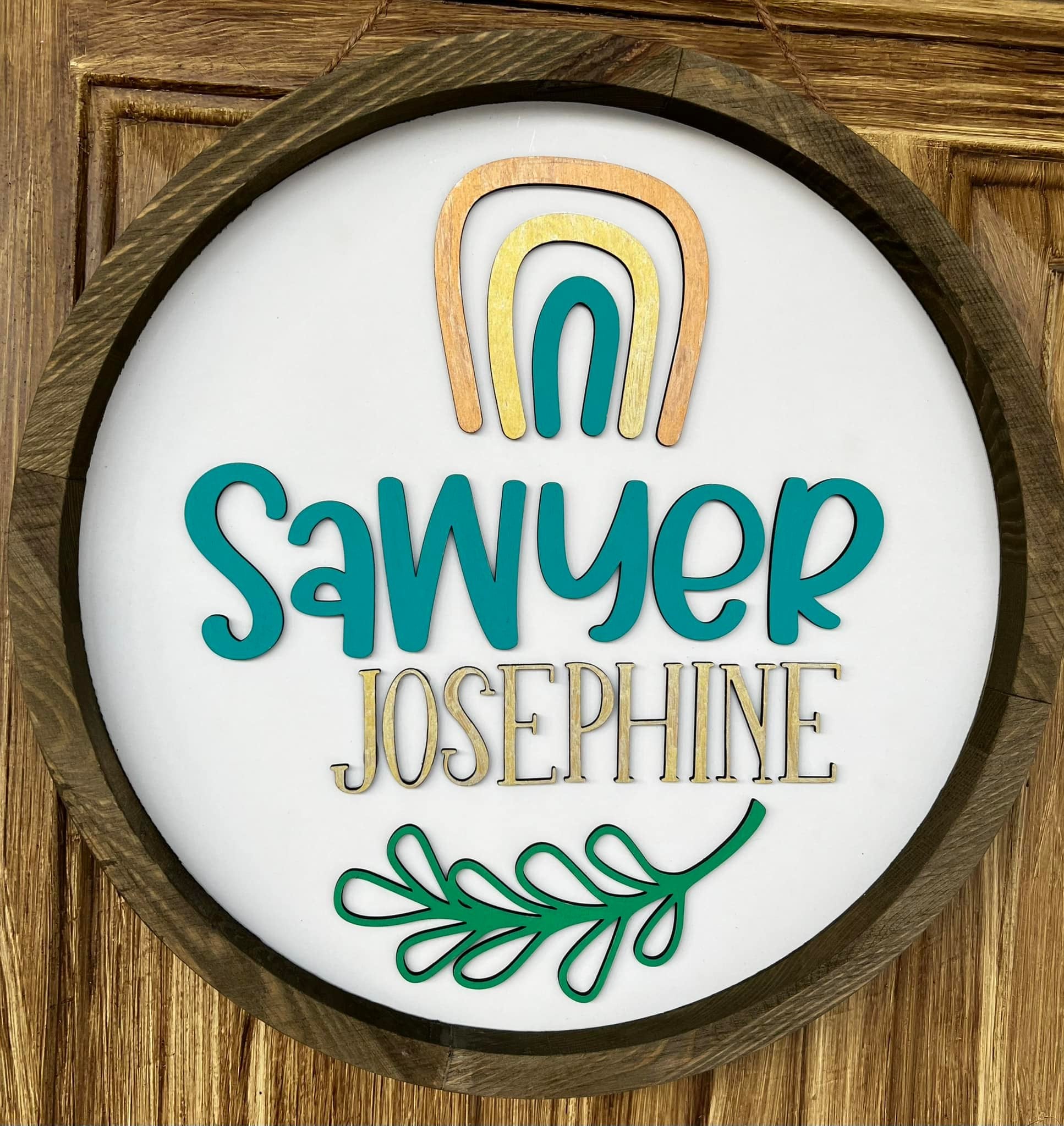 This nursery sign measures 16" big with a brown wood finish and white center. I can customize each sign to a theme. Let me know what theme you'd like in the notes in checkout. All mock-ups will be sent via email. I do require you to approve mock-ups before I make the product.