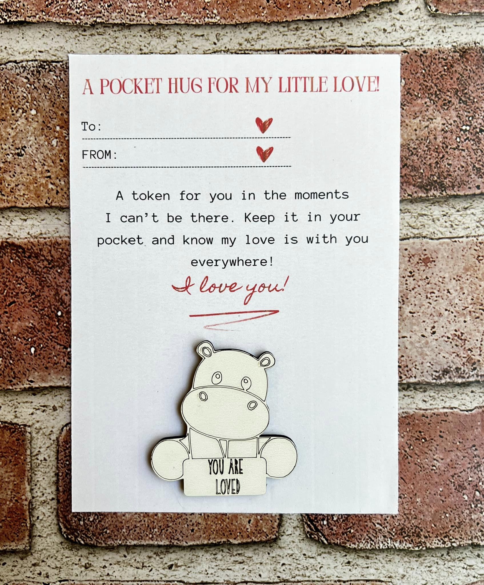 Send your child off to their first day of school, daycare, or any other setting that may make them nervous with a comforting Pocket Hug. Our adorable Hippo pocket hug is designed to provide a sense of reassurance and love, making those big transitions a little easier. Crafted from high-quality Eucalyptus wood, this pocket hug is a heartfelt token that your child can keep with them throughout the day.