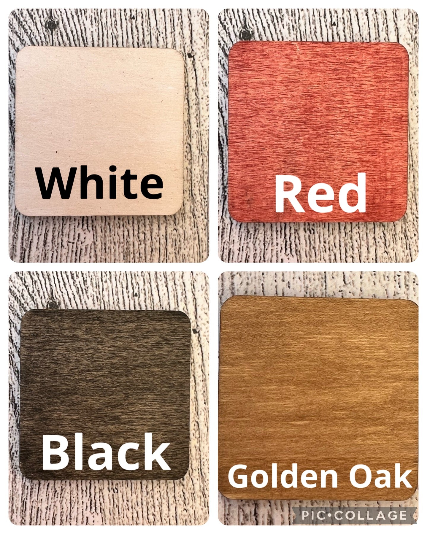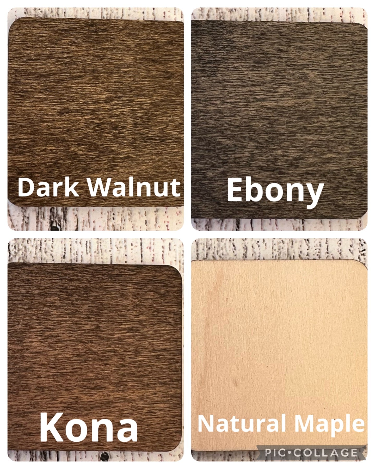 Made out of Maple wood. Colors and stains can be changed to match your wants.