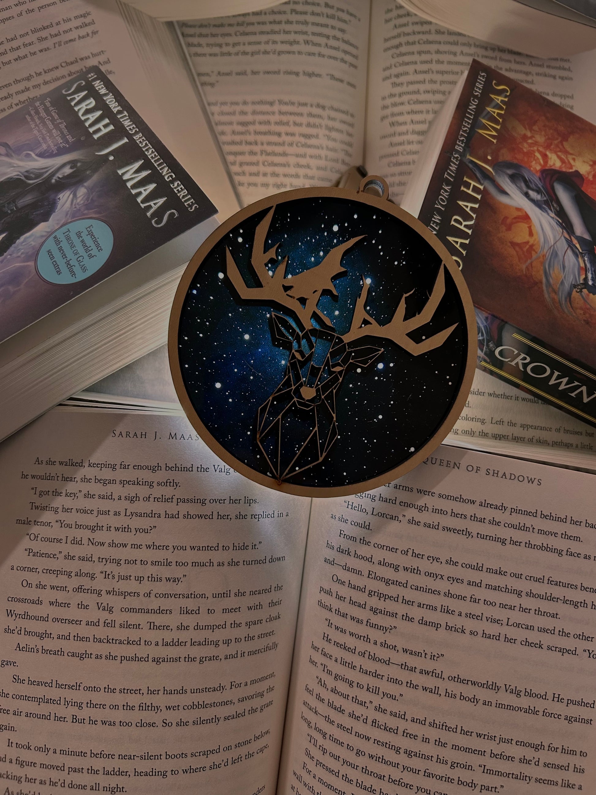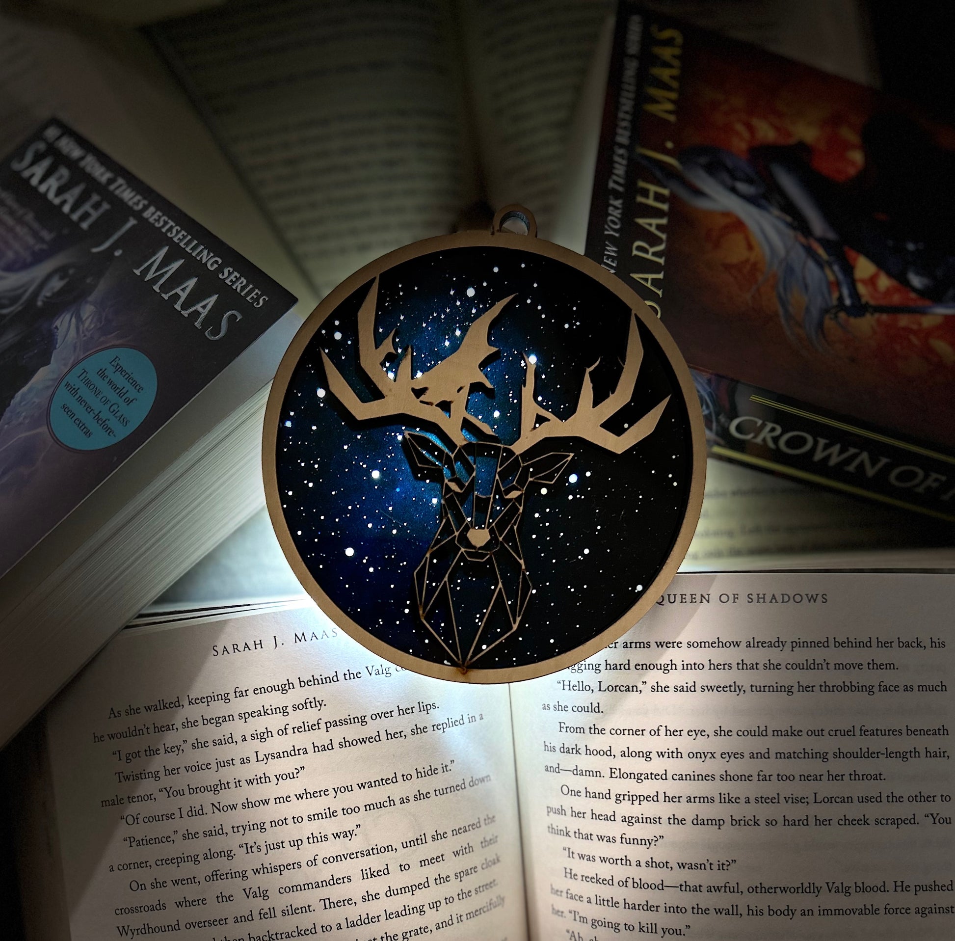 Illuminate your space with the beauty and magic of Terrasen with this breathtaking sun catcher, featuring the majestic Terrasen Stag set against a celestial starry background.