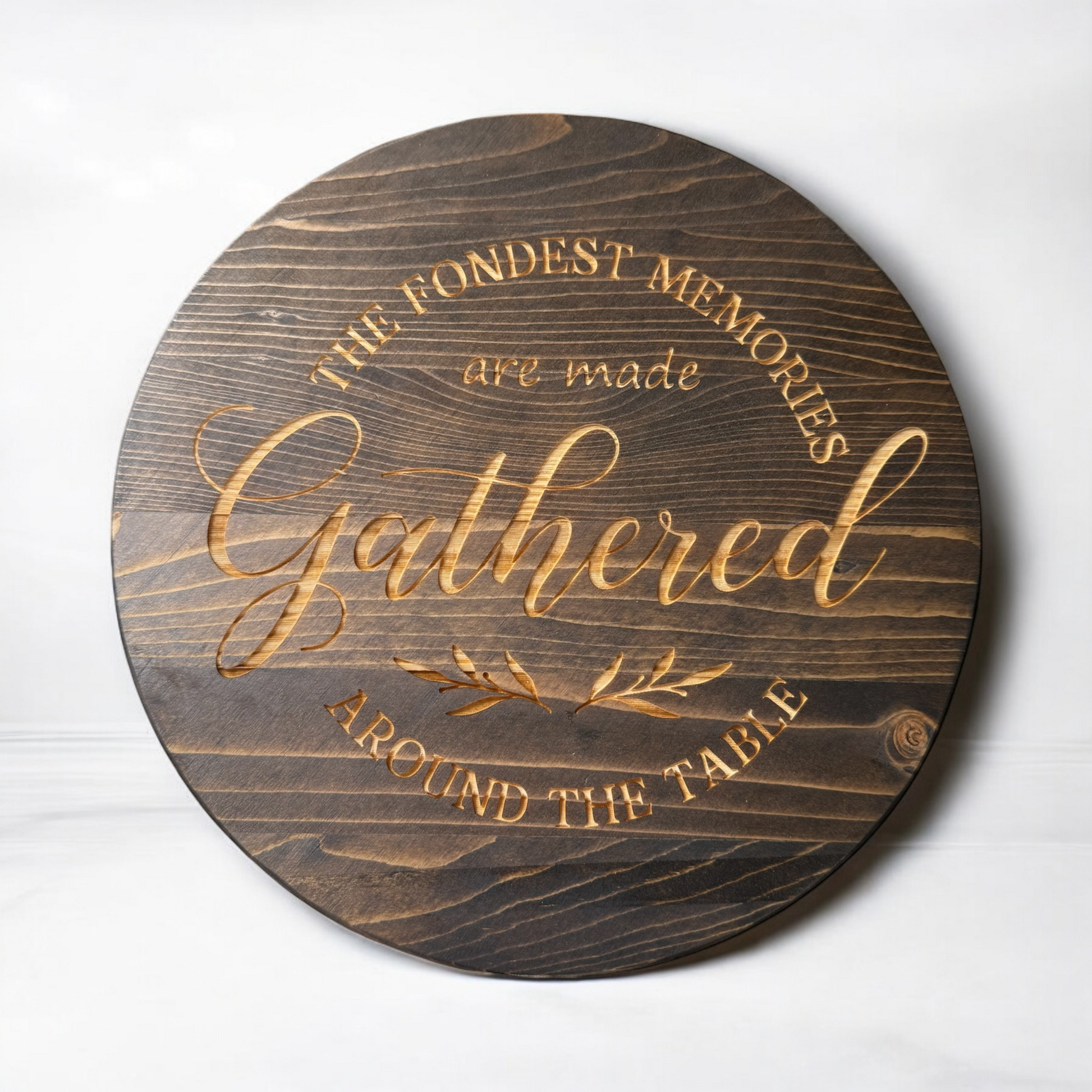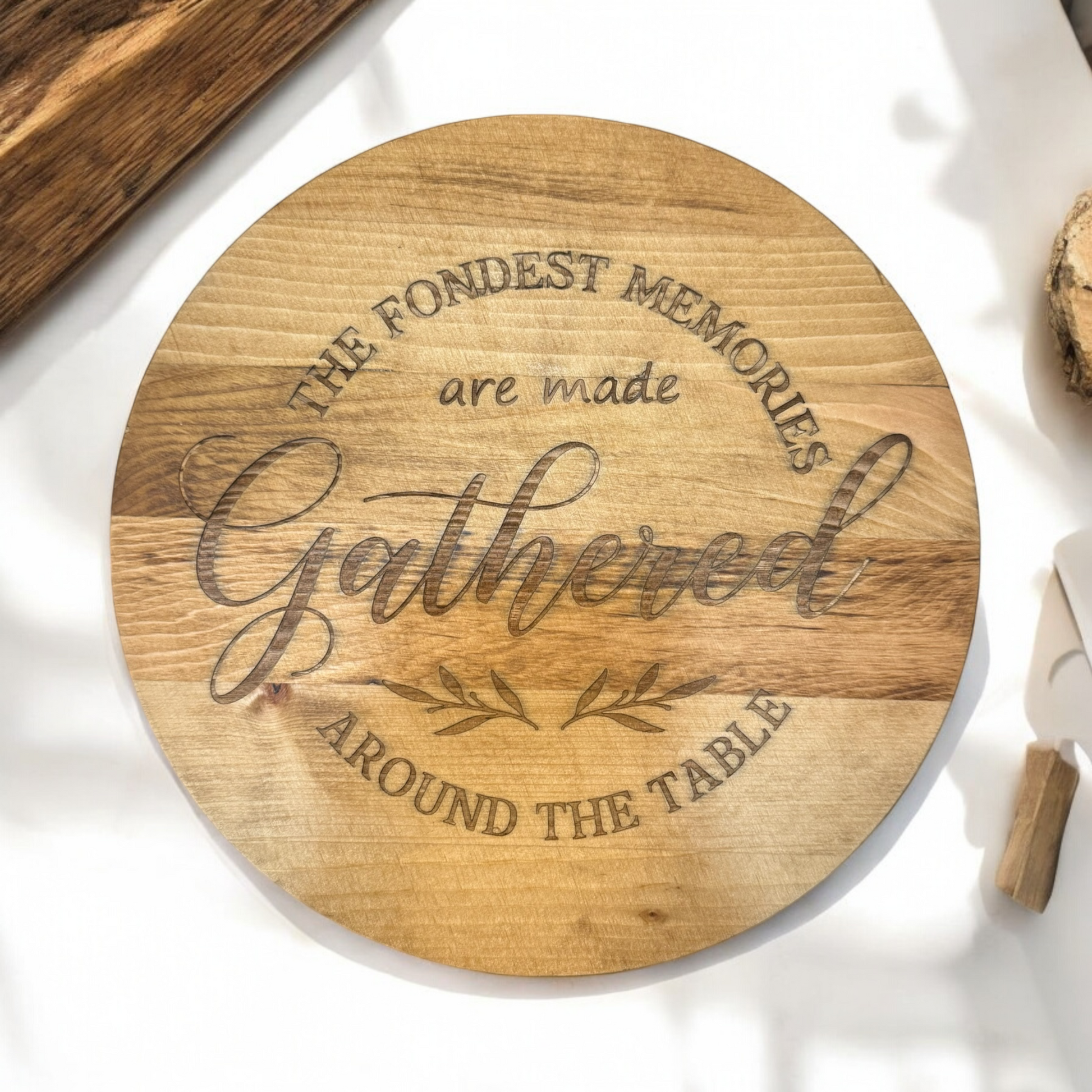 Elevate your dining experience with our beautifully crafted 12” Lazy Susan, thoughtfully engraved with the heartfelt phrase, “The fondest memories are made gathered around the table.” This elegant piece serves as a centerpiece for your gatherings, reminding everyone of the joy of shared moments.