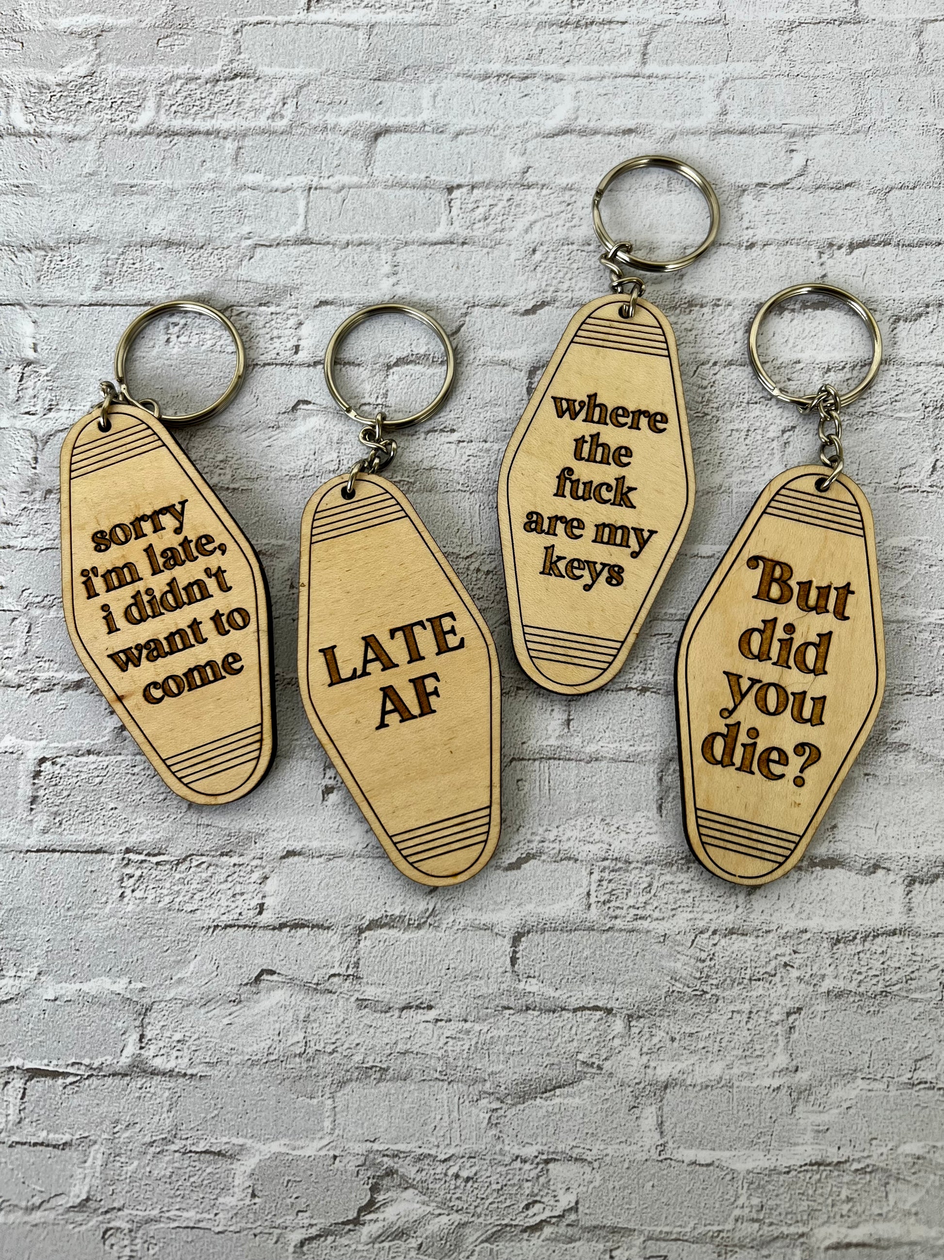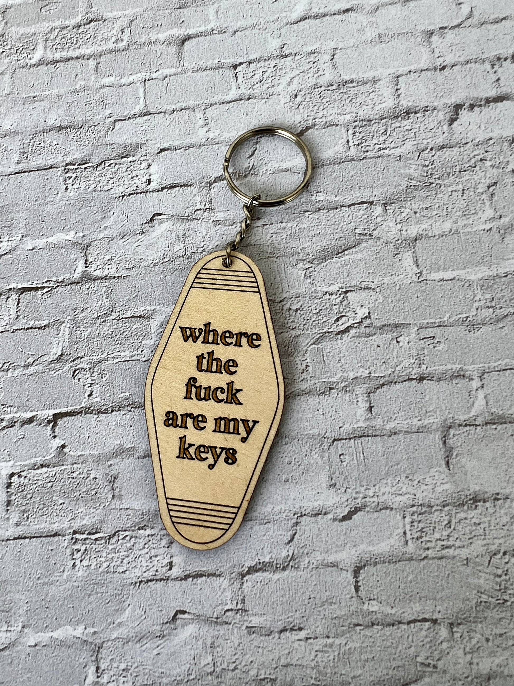 It's an engraved wooden keychain. The wood I use is: Formaldehyde free, soy based, and environmentally friendly.